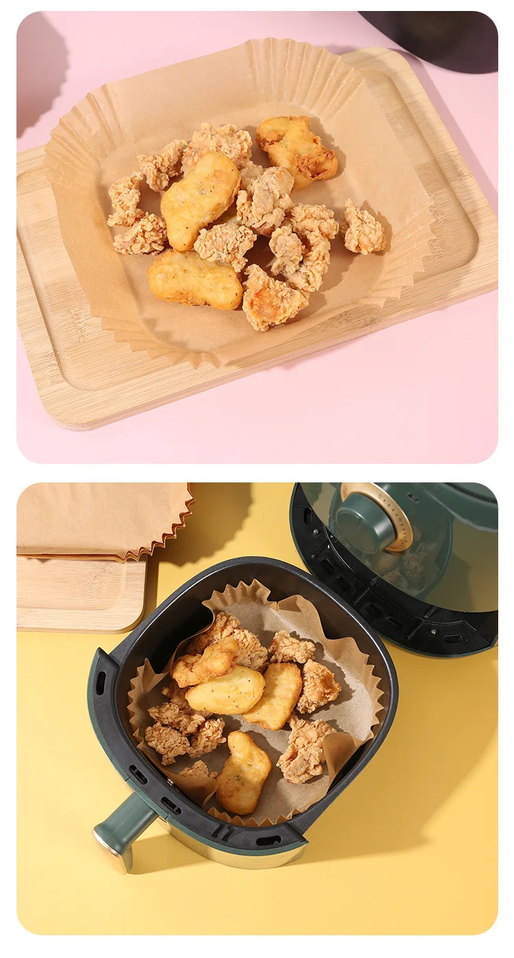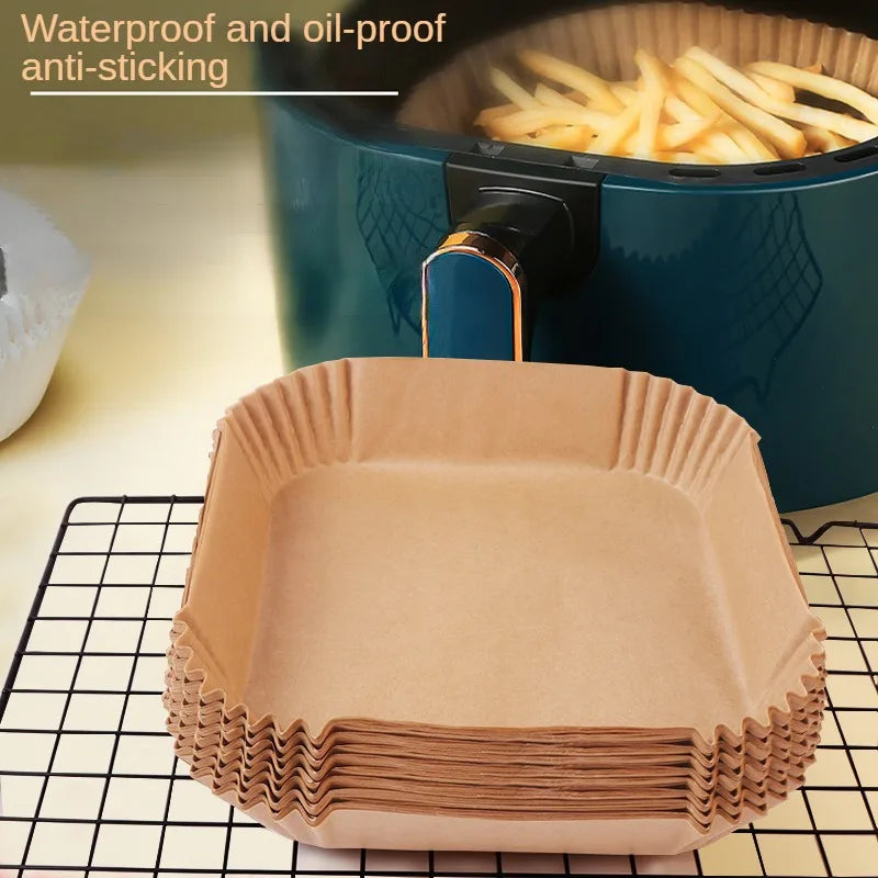 Confezione da 50 fogli monouso, pronti all'uso. Dimensioni perfette per la maggior parte delle friggitrici ad aria.